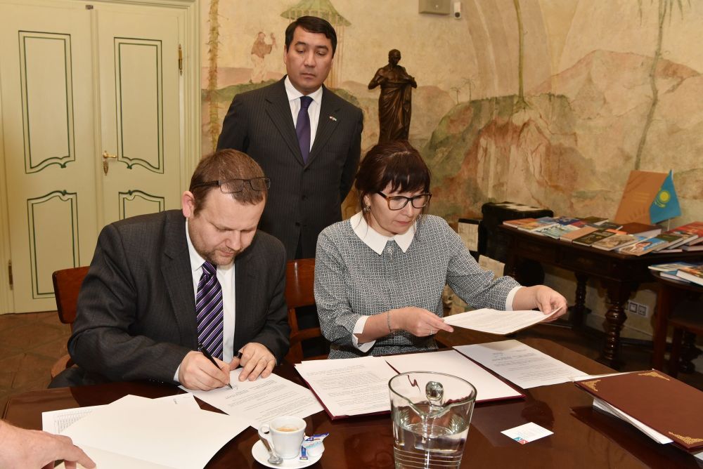 Dne 20. 12. 2017 přijal generální ředitel Národní knihovny České republiky delegaci z RGU - Národní akademické knihovny republiky Kazachstán v Astaně. Při této příležitosti bylo mezi oběma knihovnami podepsáno Memorandum o porozumění a spolupráci. Knihovna v Astaně navíc darovala do fondů NK ČR dvě stě kusů kazašských knih, které jsou reprezentativním vzorkem kazašské literární produkce, a to jak v oblasti odborné, tak krásné literatury. Foto: E. Hodíková, NK ČR.