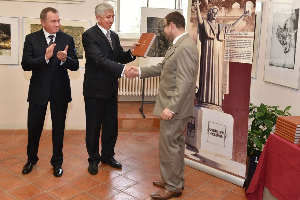 Součástí vernisáže, která se konala 15. června 2017 v Galerii Klementinum, bylo slavnostní předání vydaných faksimile edičního projektu "Knižní dědictví Františka Skoriny" do fondu Národní knihovny ČR - Slovanské knihovny. Foto: E. Hodíková, NK ČR.