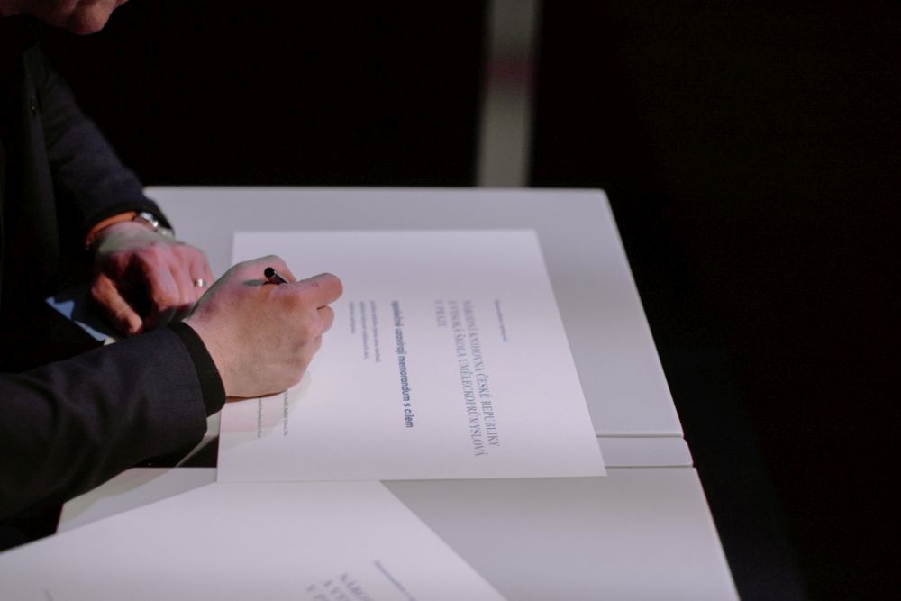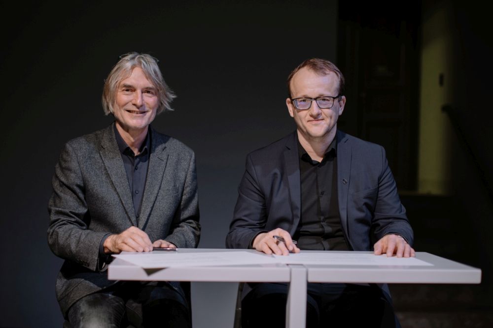 Národní knihovna ČR a Vysoká škola uměleckoprůmyslová v Praze (UMPRUM) uzavřely dne 17. října 2023 memorandum o spolupráci, jehož cílem je posílení dobrého jména obou institucí, zajištění kulturně-vzdělávacích akcí a vzájemná spolupráce. Memorandum podepsali generální ředitel Národní knihovny ČR Tomáš Foltýn a rektor UMPRUM Jindřich Vybíral. Foto: A. Typltová