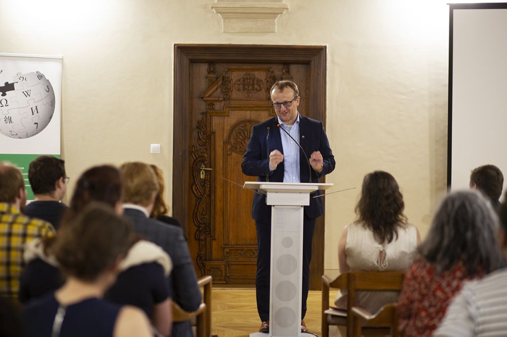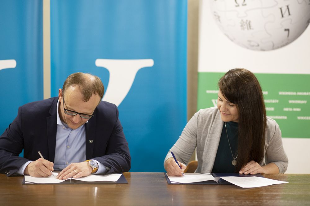 Národní knihovna a Wikimedia ČR podepsali memorandum o spolupráci na tvorbě Wikipedie, zpřístupňování databází NK přes Wikidata aj. K podpisu došlo 9. června 2023 v pražském Klementinu, spolu s prvním oficiálním setkáním zástupců Wikimedia Europe – mezinárodního sdružení 26 poboček Wikimedie. Akce se zúčastnil náměstek ministra pro legislativu odpovědný za digitalizaci Ondřej Profant, poslanec Evropského parlamentu Marcel Kolaja a další hosté. Foto: M. Tichá, NK ČR.