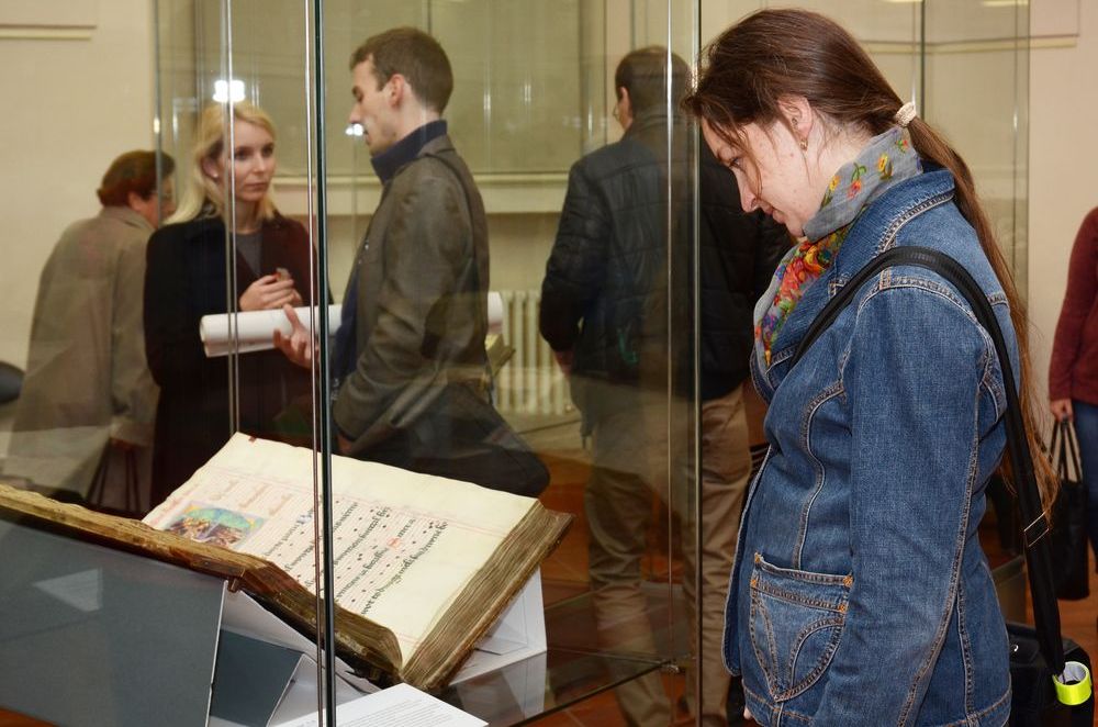 Fotogalerie z vernisáže výstava, která představuje vybrané hudební rukopisy, kancionály a graduály z fondů v Národní knihovny České republiky. Tyto rukopisy sloužily v 16. století pro zpěv na kůrech městských kostelů a objednávali je movití a vzdělaní měšťané, řemeslnické cechy i představitelé vyšší a nižší šlechty. Cílem výstavy je na uvedených příkladech ukázat jednotlivé iluminace chorálních rukopisů z hlediska nepřeberného množství ikonografických motivů, které samy o sobě představují vzorník biblické ikonografie. Galerie Klementinum - Výstavní sál: 19. 11. 2015 - 3. 1. 2016. Foto: Eva Hodíková, NK ČR.