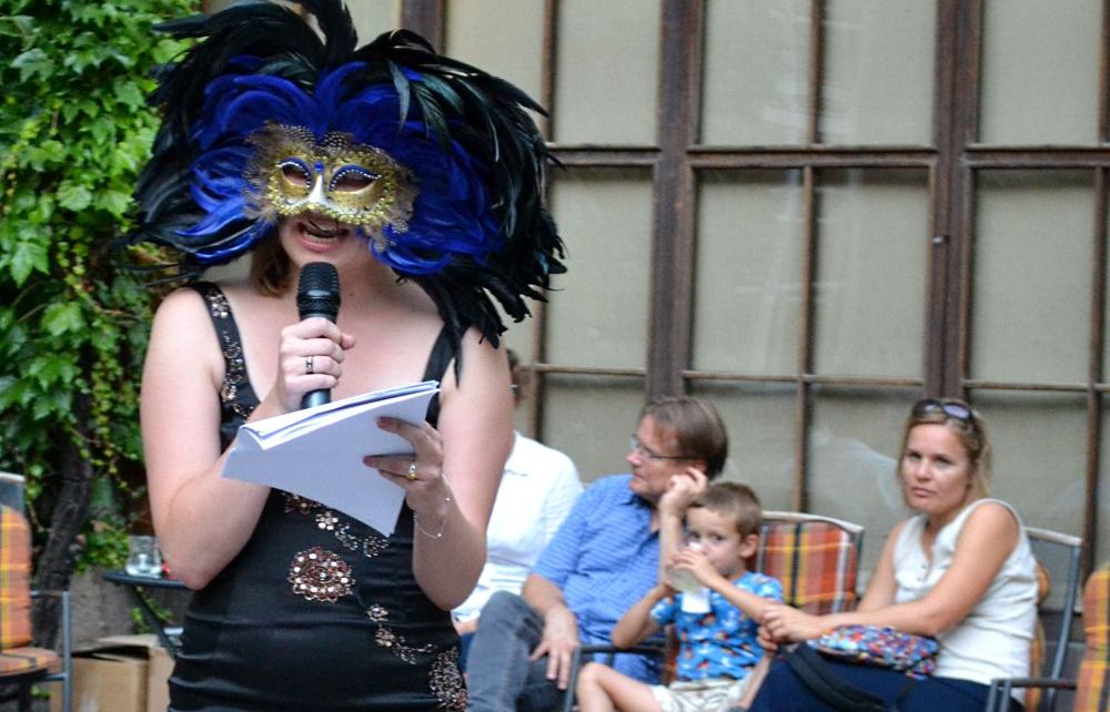 Básnický večer "V uchu pne se strom, zvěř vychází ze záře" plný orfického zaříkávání, čarování a svádění s hudebním a tanečním doprovodem v podání básníka a publicisty Adama Borziče (*1978) a básnířky, teoložky a publicistky Magdalény Šipky (*1990), který se konal 25. srpna 2016 na Révovém nádvoří Klementina. Foto: T. Vaisová, NK ČR